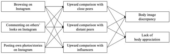 Instagram is a highly popular social media platform among female adolescents and young women. It puts an emphasis on visual representations in the form of pictures, videos, and stories, which can be “polished” thanks to the use of in-built filters and other editing applications. The platform’s characteristics led researchers and the public alike to voice concerns about a possible detrimental effect of Instagram use on females’ body image and subsequent unhealthy dieting and exercising behaviors. To shed light on the relationship between Instagram use and body dissatisfaction, the present study used theoretical insights from the Tripartite Influence Model of Body Dissatisfaction and Eating Disturbance [17] as well as Social Comparison Theory [28] and tested a mediation model linking different types of Instagram use (i.e., browsing through others’ profiles, commenting on others’ looks, and posting one’s own photos and stories) to body dissatisfaction (i.e., body image discrepancy and lack of body appreciation), mediated by upward social comparison with close peers, distant peers, and social media influencers.