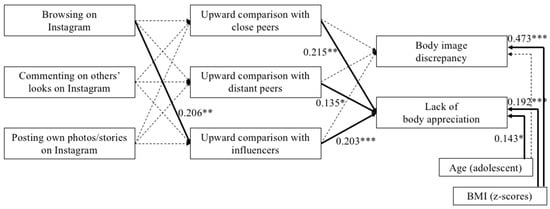 Bivariate correlations (Table 2) did not reveal any significant relationships between different types of Instagram use (i.e., browsing, commenting, posting) and body image discrepancy or lack of body appreciation. However, browsing on Instagram and commenting on others’ looks were significantly positively related to upward comparison with social media influencers. Upward social comparison was significantly positively associated among the three different comparison targets, the reverse-coded body appreciation scale, and to a lesser extent body image discrepancy, except for the relationship between upward comparison with distant peers and body image discrepancy, which was not significant. Given that being an adolescent and BMI z-scores showed significant relationships with body discrepancy and lack of body appreciation, both were added as covariates on the final outcome variables in the mediation model.