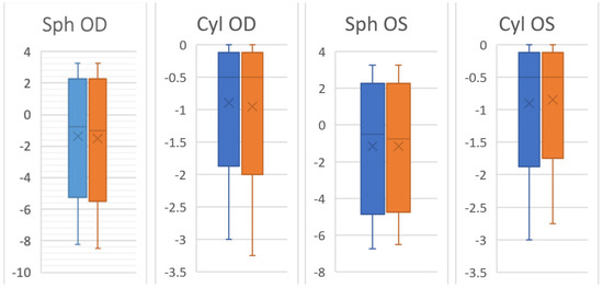 Dispersions statistics in the standing Position (blue) and the sitting position (orange). Sph OD = right eye sphere; Cyl OD = right eye cylinder; Sph OS = left eye sphere; Cyl OS = left eye cylinder.