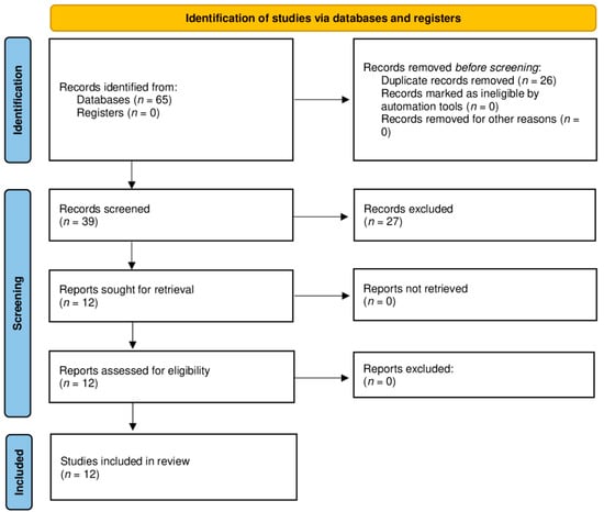 The database search strategy yielded 65 results. After excluding duplicates, the titles and abstracts of 39 records were checked for inclusion criteria by the reviewers. Twelve articles were selected for quality assessment and full-text screening and were included in the systematic review (Figure 1).