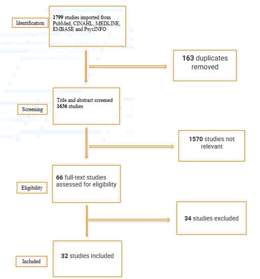 The search strategy identified a total of 1799 studies from the electronic databases searched using Covidence software (Covidence.org: Melbourne, VIC, Australia). The Covidence software automatically screened and removed 163 studies as duplicates. The remaining items (1636) were screened against the eligibility criteria set by the authors based on the title and abstract only, yielding 66 remaining records for full-text screening. Thirty-four studies were excluded in the full-text screening phase, leaving a final pool of 32 studies that were eligible for inclusion in this scoping review.