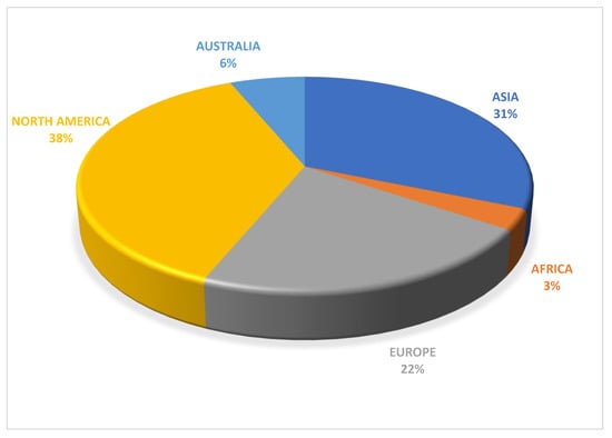 The thirty-two studies included a total of 306,173 subjects. This scoping review included studies from 2005 to 2021. The majority of studies (75%) were published in the last ten years (2011 to 2021), 25% were from 2005 to 2010, and seven studies were from 2005–2009. Most of the studies were conducted in North America (38%), Asia (31%), and Europe (22%), while African and Australian studies represented 3% and 6%, respectively (Figure 2). In total, 50% of the studies examined firefighters, while the other 50% examined military personnel.