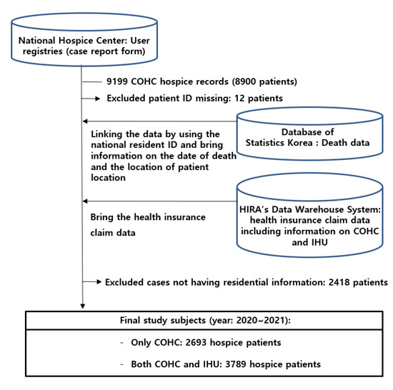 The units of analysis were individual patients who received COHC. This study had a cross-sectional study design using hospice utilization data between 1 April 2018 and 31 March 2020. There were 97 hospitals implementing any types of hospice programs as of 31 December 2020. Among them, 70 hospitals were providing hospice care with IHU, 9 were offering COHC only, and 18 hospitals had both programs with COHC and IHU. The main study was conducted in the Health Insurance Review and Assessment (HIRA) Service in Korea. For the study purpose, this study was approved by the Institutional Review Board on 14 April 2020 (IRB No: 2020-026-002).