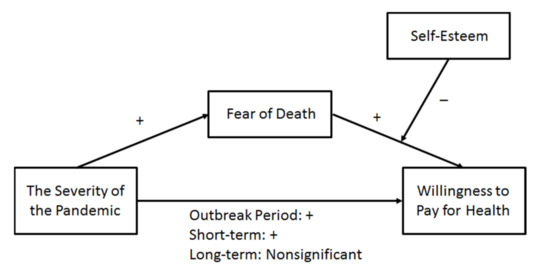 In the present study, we choose residents’ willingness to pay for health (WPH) as our dependent variable in light of the following considerations. First, the consumption of goods that are beneficial to health is an important means of securing health. Compared to the temporary self-protection behaviors that have been investigated by previous research [11,12], WPH can reflect residents’ more general health awareness in their daily life. Second, WPH has been found to be more related to economic recovery after the pandemic. During the past 2 years, people have been gradually paying more attention to saving rather than consumption to cope with the economic downturn caused by the pandemic [15,16]. If the pandemic could lead to an increase in residents’ WPH, the health industry will usher in an important developmental opportunity and help the economy recover. Finally, studying the impact of the pandemic on WPH is consistent with the value orientation of promoting residents’ public health. In recent years, governments and scholars across the world have been paying increasing attention to the promotion of healthy behaviors for the public. Most of the existing literature has primarily focused on the negative impacts of the pandemic, such as anxiety, depression, and posttraumatic stress disorder (PTSD) [17,18]; however, this study focuses on the positive effects of the pandemic and has a more constructive value for public health policy. Given the aforementioned facts, can the COVID-19 pandemic serve as an opportunity to improve people’s health-related consumption behaviors? If so, how long will such a positive effect last? These are matters worth exploring. Against this background, the present study will explore the following questions. First, how does the COVID-19 pandemic affect people’s WPH in the short and long term? Second, what is the psychological mechanism underlying such an effect? Finally, what are the boundary conditions for this effect? To answer these questions, we constructed a theoretical model in which the severity of the pandemic (SP) acts as the independent variable, WPH as the dependent variable, the fear of death (FD) as the mediating variable, and self-esteem as the moderating variable.