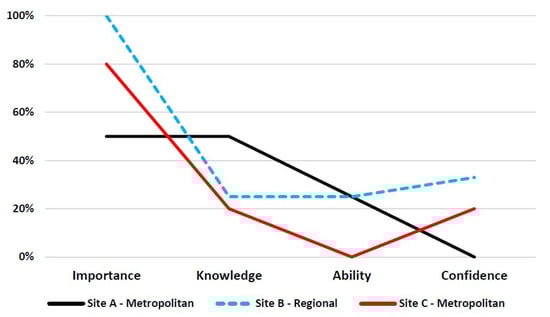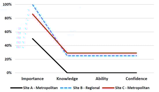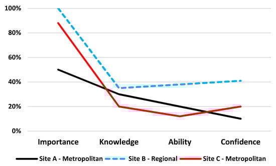 At site A—metropolitan, although half (50%) of the medical doctors rated both the importance and their knowledge of effectively communicating with Aboriginal and Torres Strait Islander patients as “high”, only a quarter (25%) rated their ability as “high”, and none (0%) rated their confidence to communicate with Aboriginal and Torres Strait Islander patients as “high” (Figure 2).