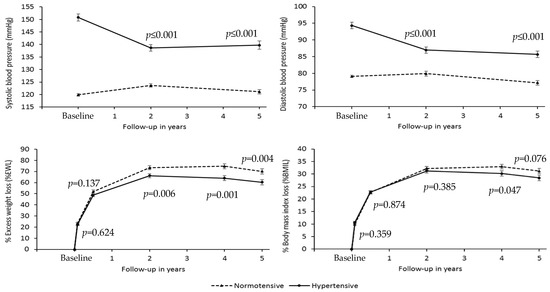Changes in blood pressure, percentage of excess weight loss, and percentage of body mass index loss during the follow-up period in hypertensive and normotensive patients. The p-values in the figure correspond to the differences between groups in the different periods. The bars show a standard error. A repeated measures model has been applied.