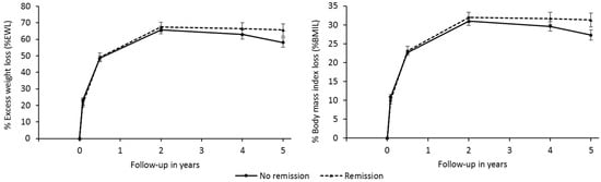 Figure 2 shows that % EWL and % BMIL behave similarly in the group that experienced remission and in the group who did not, displaying a trend reversal close to being significant between years four and five, with p-values of 0.073 and 0.056 (interaction effect). The group that did not experience remission had the highest values of % EWL and % BMIL at two years (65.7 ± 20.5% and 31.0 ± 10.1%, respectively), although there is a decrease in these percentages from then on. The mean falls of % EWL between years two and five were 7.6% (95% CI 2.7; 12.6, p-value = 0.003) and 3.7% (95% CI 1.4; 6.0, p-value = 0.002) in % BMIL. It can be clearly seen that the group that experienced remission maintains the maximum values found at two years (67.4 ± 16.9% and 31.9 ± 8.1%, respectively) during the rest of the follow-up period, with a fall that varied between 1.7% in % EWL (95% CI −4.5; 7.9, p-value = 0.573) and 0.6% in % BMIL (95% CI −2.3; 3.7, p-value = 0.659).