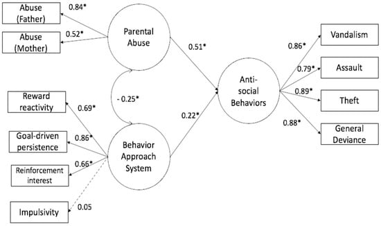 Structural model of child abuse and the behavior approach system and its influence on adolescent antisocial behavior. Mardia = 285.11, SBX2 (32 D.F.) = 38.27, p = 0.20, BBNNFI = 0.96; CFI = 0.97; RMSEA = 0.02, R2 = 0.37 * p < 0.05.
