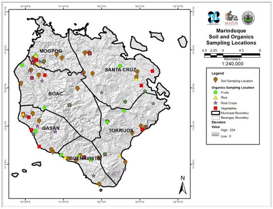 The vegetable and soil samples were collected from six municipalities of Marinduque, namely Boac (B), Buenavista (BV), Gasan (G), Mogpog (M), Sta. Cruz (S), and Torrijos (T). Sampling locations were distributed spatially over the six municipalities of the island province. Coordinates of every sampling point were recorded and plotted using Geographic Information Systems as shown in Figure 1. Generally, the land use of the sampling points from the island province is mainly agricultural [,].