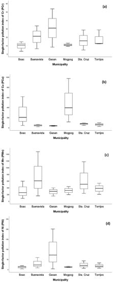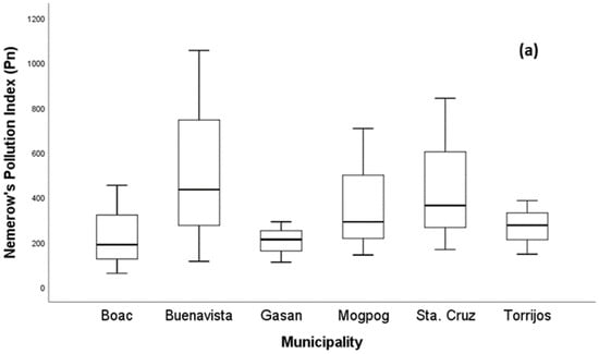 In order to obtain the status of soil pollution from each municipality, the values of and were calculated using the Nemerow pollution index (NPI). The NPI illustrates the degree of probable pollution a metal contributes, and/or how several metals probably pollute a target environmental medium. As illustrated in Figure 2, all mean values of soil from each municipality were greater than five except for Cd which was not detected. This implies that the soil from all municipalities belongs to Class V with severe pollution level (Table 1) and is quite alarming []. Heavy metal pollution of soil is a serious environmental hazard, particularly in locations where soils intended for agricultural practices are adjacent to sources of pollution such as mining [].