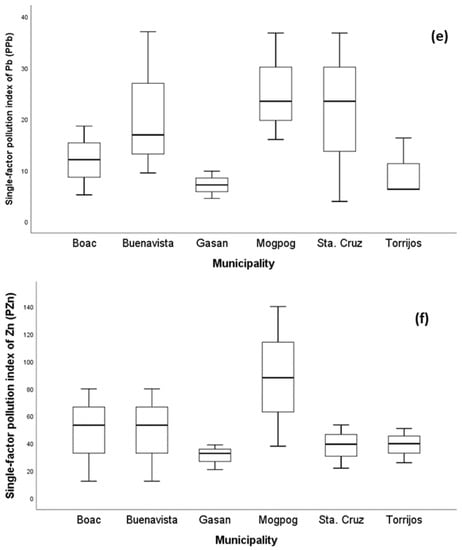 The single-factor pollution index () of soil per municipality of the island province. The of (a) Cr, (b) Cu, (c) Mn, (d) Ni, (e) Pb, and (f) Zn in soil from all municipalities across the province.