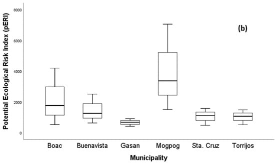 As illustrated in Figure 3a, the values in all soil from each municipality ranged from 61.35 to 1055.83, which are greater than three indicating that all soil samples were under Class V with severe pollution level (Table 1). The of soil in all municipalities had the following order: BV > S > M > T > G > B. In Figure 3b, the higher pERI was found in the soil of Boac and Mogpog in comparison with Buenavista, Gasan, Sta. Cruz, and Torrijos. More specifically, in Mogpog, the single ecological risk index () of Cu was greater than 1200, ( = 1968.03), indicating a higher contribution of Cu to RI. The RI of soil in Boac, Buenavista, and Mogpog exceeded 1200; hence, there is very high pollution risk. On the other hand, the RIs of Gasan, Sta. Cruz, and Torrijos were between 600 and 1200 indicating a high pollution risk too. The high pollution risk of the soil due to metal pollution can adversely impact plant growth [], microbial diversity [], biota [], and humans whose exposure includes incidental ingestion, inhalation, and dermal contact [].