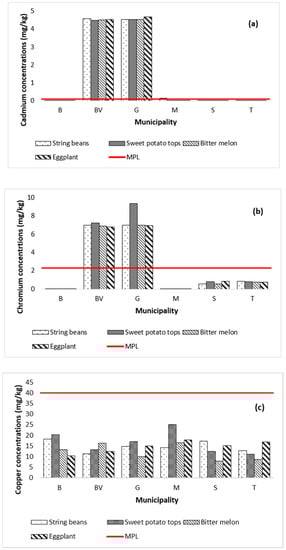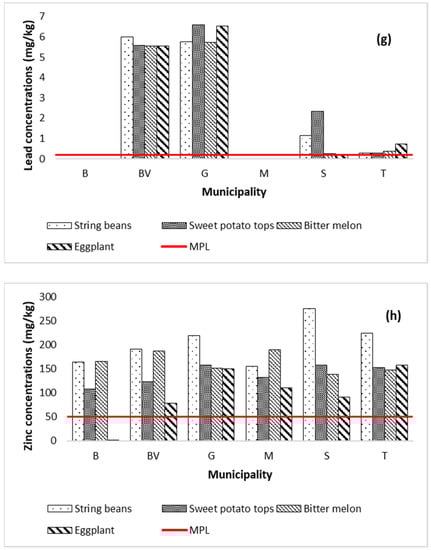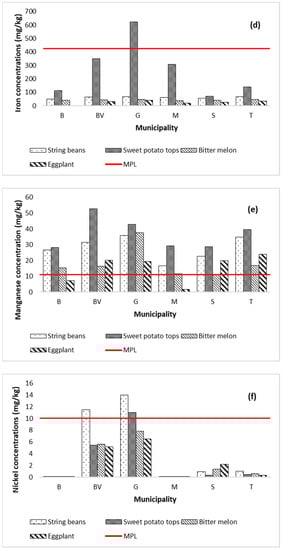 The mean concentrations (mg kg−1) of metals in the vegetable samples collected from Marinduque are shown in Figure 4a–h with a red horizontal line representing the maximum permissible limits (MPL) set by World Health Organization, Food and Agriculture Organization and International Food Standards []. Metal concentrations in vegetables are represented by Y-coordinates and illustrated by vertical bars. The MPL (mg kg−1) for Cd, Cr, Cu, Fe, Mn, Ni, Pb and Zn concentrations illustrated in Figure 4a–h are 0.1, 2.3, 40, 425, 11, 10, 0.2 and 50, respectively [,,,,,]. The string bean samples had concentrations (mg kg−1) of Cd (0.004–4.581), Cr (0.0005–6.968), Cu (48.34–68.50), Fe (48.40–68.58), Mn (16.72–35.75), Ni (0.001–13.978), Pb (0.012–5.986), and Zn (155.98–275.50). Metal concentrations in sweet potato tops ranged from 0.004 to 4.531 Cd, 0.0005–9.323 Cr, 11.13–24.99 Cu, 70.84–625.35 Fe, 28.21–52.84 Mn, 0.001–11.022 Ni, 0.012–6.581 Pb, and 107.73–157.99 Zn. The bitter melon samples had concentrations of Cd (0.004–4.541), Cr (0.0005–6.9625), Cu (7.95–16.44), Fe (37.70–47.76), Mn (11.26–37.54), Ni (0.001–7.811), Pb (0.01–5.74), and Zn (138.54–190.24). Metal concentrations in eggplant range from 0.004 to 4.675 Cd, 0.0005–6.9128 Cr, 10.433–17.822 Cu, 3.20–39.57 Fe, 1.86–23.94 Mn, 0.001–6.494 Ni, 0.012–6.533 Pb, and 0.001–157.630 Zn. It was recorded that Zn concentration in all types of vegetables across the island province exceeded the MPL except for the eggplant collected from Boac. The Fe in sweet potato tops collected from Gasan municipality exceeded the MPL. Additionally, the concentration of Mn in all types of vegetables, except for the eggplant collected from Mogpog, exceeded the MPL. Likewise, Cd and Cr concentrations in most types of vegetables from Buenavista and Gasan exceeded the MPL. It was also recorded that concentration of Pb in most types of vegetables from Buenavista, Gasan, and Sta. Cruz exceeded the MPL. Only the string beans from Buenavista and Gasan and the sweet potato tops from Gasan exceeded the MPL for Ni. The spatial distribution map of metal concentrations in soil and vegetables is illustrated in Appendix A to further visualize the potential distribution of metal concentrations across the island province.