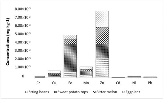 It is useful to note that the leafy vegetable (sweet potato tops) had accumulated the highest metal concentrations. Similar findings have been reported by Luo et al. [], indicating that leafy vegetables accumulate metals more than non-leafy vegetables. The distribution trend of metal concentration in vegetables is shown in Table 4. It shows that Zn had the highest concentration, among target metals in all vegetables across the six municipalities.