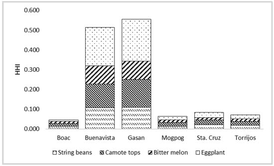 The EDI of metals through consumption/oral intake of vegetables by the population in Marinduque is presented in Table 5. The eggplant contributed most to the population EDI given that it has the highest among the vegetables tested. It was followed by sweet potato tops then string beans and lastly bitter melon as illustrated in Figure 5. The metals of concern in vegetables were Cd, Cr, Fe, Mn, Pb, Zn, and Cu. The EDI of individual metals as a result of vegetable consumption was in the order of Zn > Fe > Mn > Cu > Ni > Cr > Pb > Cd. Bar plots are illustrated in Figure 5 and Figure 6 to visualize the concentration of metals in each vegetable type and the potential contribution of specific vegetables to the HHI of each municipality.