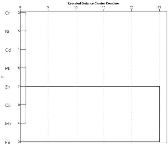 HCA was further used to determine the affinity and behavior of metal in the soil across the province. Figure 7 shows the dendrogram results generated by HCA for metals. The following two primary clusters were identified: (1) Cr-Ni-Cd-Pb-Zn-Cu-Mn and (2) Fe. It produced results that were similar to those of the Pearson correlation analysis.