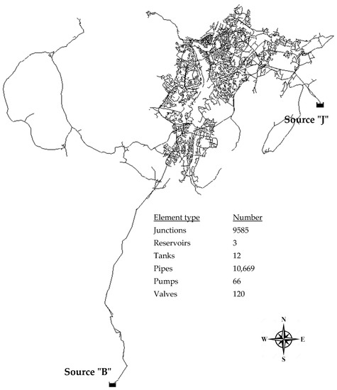 There are two main sources of the drinking water: sources “J” and “B”. The daily operation of the WDN involves the simultaneous operation of both sources, but the WDN must also allow uninterrupted service should one of the two sources fail. This imposes a complex operational strategy and operational flexibility (e.g., a control system for the pumps, valves, and tanks). Of particular interest in this study, a risk-based rehabilitation approach shall be proposed to help the municipality decide their pipe rehabilitation plan based on a set of risk criteria presented in the following sections.