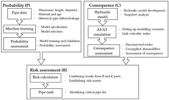 Figure 2 depicts the methodology of the risk-based rehabilitation method proposed in this study. The method encompasses two independent components, i.e., Probability (P) and Consequence (C) assessment, that contribute to the Risk Assessment (R). The probability assessment involves a machine learning method that assesses the pipe failure probability based on the historical data. The consequence assessment requires a hydraulic model to evaluate the criticality of each pipe for the operation of the WDN and to quantify the flow conveyed by each pipe. The following sections provide in-depth explanation of the approach implemented in the risk-based pipe rehabilitation method.