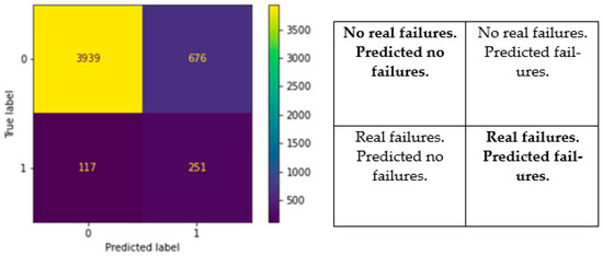 The validation period, i.e., the length of the period on which the model was run in order to compare real failures with predicted failures, was 5 years. The meaning of the four quadrants follows the definition of actual vs. predicted interactions given in Table 1. The BA model predicted a total of 927 failures during the prediction period. This is the sum of the quadrants (predicted label = 1 and True label = 1) and (predicted label = 1 and True label = 0). The results further show the following: