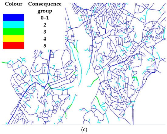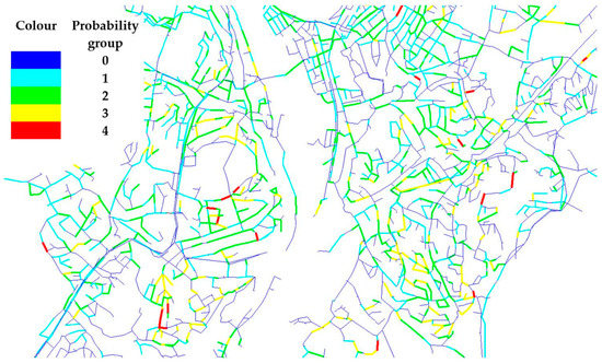 p values were grouped into five different levels and the number of pipes corresponding to each group are shown in Table 6. The results were further used in the estimation of the risk of each pipe. The outcome of RF analysis shows that there are 47 pipes belonging to the group with highest p values during the next five years. The splitting of the probability in groups, as was the case in this study, shows that the number of pipes tends to increase as the probability decreases. To avoid sharing critical information, Figure 5 shows only an excerpt of the WDN with coloured pipes according to the probability classification to illustrate the locations of these pipes. The pipes with high p values are scattered across the WDN and the main supply pipes from the two sources do not fall into the category of pipes with high P. As seen also in the figure, pipes belonging to one segment do not necessarily exhibit same p values owing to the individual pipe data and RF simulation that can emphasize such differences. Certainly, there is just one set of p values from RF-BA analysis used in this study irrespective of the supply scenarios modelled, simply because the P is independent of supply scenarios and relies solely on pipe data.
