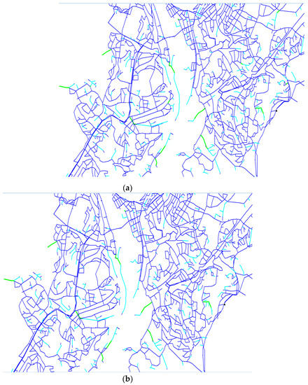 Among the many elements in a WDN, pipes are the primary components for conveying water to customers. Each of these pipes can suffer failure (e.g., intentional due to maintenance or unintentional due to breakage) that decreases network functionality depending on the importance of the pipe, as well as impacting the provision of water supply for the customers [20]. The criticality of a pipe is usually assessed by quantifying the decrease in the network functionality in a WDN reliability analysis. The reliability concept has been a central concept in WDN design, operation, and maintenance, and was developed as a continuation of the classical reliability concept that divides reliability into mechanical and hydraulic reliability [21,22] and uses various indices and methods of assessment. In general, the mechanical reliability puts emphasis on the network topology by evaluating system connectivity under given failure conditions. Pipe failure statistics [23] and probability [24] are later incorporated into the mechanical reliability analysis to better indicate the criticality of pipes in a WDN, and some studies include the water availability aspect in their simulation of pipe failure and repair events [25]. On the other hand, hydraulic reliability refers to the ability of a system to meet the requirements of water flow and pressure. Quantification of the hydraulic reliability involves results from hydraulic simulation through the use of nodal pressure [26] or even more complex approaches, e.g., unsupplied demand, economic loss, pressure deficiency, water quality [27], and energy [28].