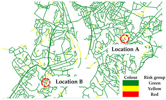 A list of pipes with the highest risk values, i.e., values of multiplication of P and C, was then established. Following this definition, it was possible to simply populate the three risk groups based on the PC values, i.e., values/color-coded risk groups, as outlined in Table 3.