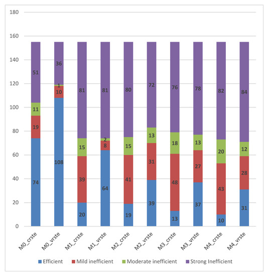 3.1. Efficiency of the Total Model (M0), Which Includes all Inputs and Outputs in the DEA Analysis under Both the CRS and VRS Assumptions