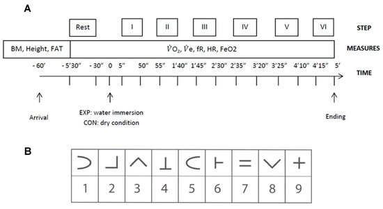 Timeline of the experimental session, including (A) the Step sequences and (B) an example of the SDMT matrix. Note: The full SDMT test depicts a printed matrix on one sheet of paper that includes a random sequence of 45 symbols and blank squares. Each square is completed by the participant who either writes their answer into the square (on land), or verbally indicates their answer to the researcher, who immediately records the result (water trials).