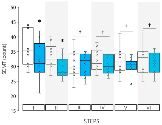 SDMT results for control (open boxes) and experimental trials (shaded boxes). (*) Indicates a significant difference between trials for that Step, (†) Indicates a significant time main-effect difference from Step I (p < 0.05).