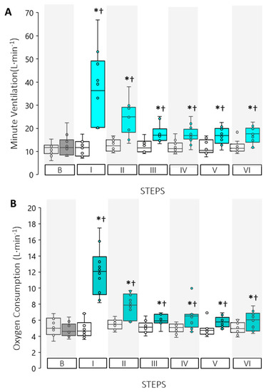 Respiratory results for control (open boxes) and experimental trials (shaded boxes) for (A) minute ventilation E, and (B) oxygen consumption O2. (*) Indicates a significant difference between trials for that Step, (†) Indicates a significant time main-effect difference from Baseline (p < 0.05).