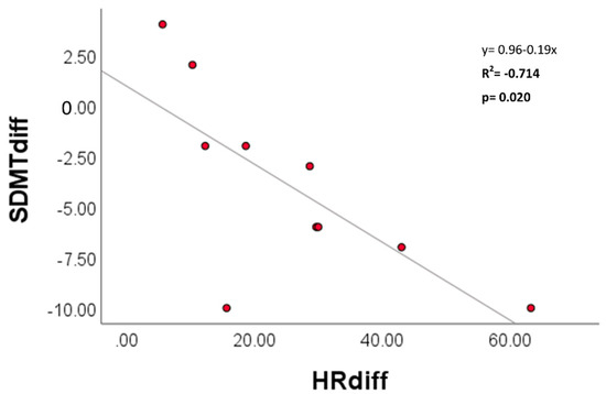 Both the change in HR and change in %HRR were significantly correlated to poorer cognitive function, observed in SDMT Step I scores between trials (Figure 5). The strength of the linear relationship was strong, accounting for ~71–72% of the variance observed in variables between trials. No respiratory variables met the a priori level of significance.