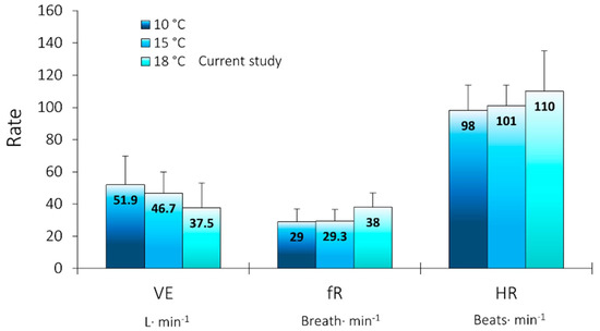 Comparing the initial cardiorespiratory cool water-shock responses (i.e., the Step I values) to those found elsewhere in the literature [28,29], our initial changes in minute ventilation were slightly lower than those observed in colder, 10 °C or 15 °C water, and both fR and HR were slightly higher, but all measures were within the standard deviation reported in the published studies (Figure 6).