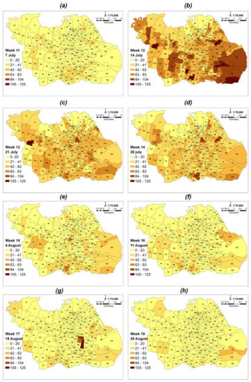 The peak distribution of confirmed COVID-19 cases per 100,000 populations every week in Surabaya (complete period figure for 26 weeks can be accessed in Supplementary Figure S3. (a) 11th Week (7–13 July).; (b) 12th Week (14–20 July.; (c) 13th Week (21–27 July).; (d) 14th Week (28 July–3 August).; (e) 15th Week (4–10 August).; (f) 16th Week (11–18 August).; (g) 17th Week (19–24 August).; (h) 18th Week (25–31 August).