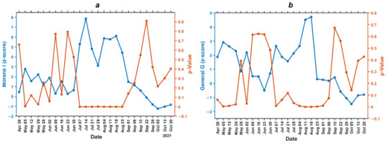 The p-value and z-score have an inverse relationship where the p-value is close to 0, with a high z-score indicating a cluster pattern. Moran’s I global statistics (Figure 4a) indicate that the COVID-19 cases in the dataset have a random pattern and are clustered during the spike in cases from July 7th to August 24th, 2021. The p-value at the peak of cases, for example between 7 July to 24 August 2021, ranged from 0–0.001, while the z-score value ranged from 3.111–7.867. This demonstrates that the Moran’s I spatial autocorrelation is statistically significant with a confidence interval of 99.9%. After the decline in COVID-19 cases in September, the distribution pattern of cases became random with a p-value of 0.139–0.909 and a z-score of −1.235–1.478. The more negative z-score value indicates a random pattern.