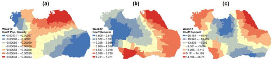 The spatial relationship in week 12, the virus peak, demonstrated that three parameters had a modest correlation (0.55). This model explained about 55% variation in the independent variables responsible for its incidence. The higher coefficient values of independent variables predict a good explanation for the dependent. In suspected people parameters, which are the most influenced factor, several affected zones were found in the northeast, northwest, and southwest parts, as shown in Figure 5c. In population density, strong influence zones were found in the north part of the city (Figure 5a). Meanwhile, in recovered patient parameters, strong influence zones were found in the northeast, east and south parts, as shown in Figure 5b.