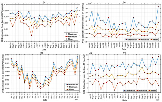 This section aims to assess the air pollutant level of CO, NO2, O3, and SO2 in the troposphere by employing remote-sensing data. Sentinel-5P image processing performed with the Google Earth Engine (GEE) resulted in maximum, minimum, and average pollution concentrations in the troposphere during the 26-week study period, as shown in Figure 6.