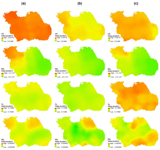 Air parameter concentration (CO, NO2, O3, and SO2) in Surabaya: (a) a month before, (b) next day, and (c) a month after region lockdown.