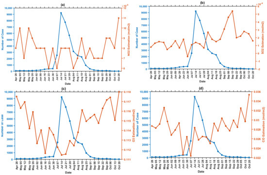 Graph correlation of COVID-19 incidence and air parameter based on Sentinel-5P image processing in GEE per week. (a) NO2 tropospheric concentration, (b) SO2 tropospheric concentration, (c) CO tropospheric concentration, and (d) O3 tropospheric concentration.