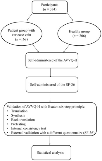 - Leal, F.D.J.; Couto, R.C.; Pitta, G.B.B.; Leite, P.T.F.; Costa, L.M.; Higino, W.J.; Sousa, M.S.C.D. Translation and cultural adaptation of Aberdeen Varicose Veins Questionnaire. J. Vasc. Bras. 2012, 11, 34–42. [Google Scholar] [CrossRef]