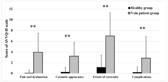 Discriminant validity of the AVVQ-H scores among the healthy and patient groups Mean ± SD, ** Significant difference (p < 0.001) between healthy and vein patient group.