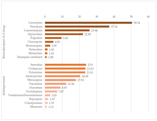 Benzodiazepines or Z-drugs were prescribed concomitantly with SO in 15,883 (70%) patients, of whom 9084 (57%) were aged >75 years, and 12,800 (80.6%) were female. Table 2 shows the types of benzodiazepine prescribed. The most frequently prescribed was lorazepam, in more than half the patients (Figure 1).