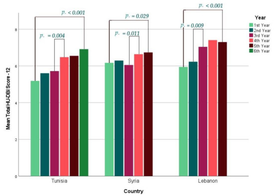 | Country | Lebanon | 3.34 ± 1.16 | <0.001 | 1.21 ± 0.83 | 0.262 | 2.12 ± 0.73 | <0.001 | 6.67 ± 1.83 | <0.001 |