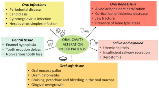 Oral health of CKD patients is significantly compromised, and it is estimated that nearly 90% of them present an oral cavity alteration, including periodontal disease, impaired mineralization of the bone matrix, gingival hyperplasia and alterations of saliva secretion and composition []. Furthermore, CKD patients show a greater predisposition to oral infections []. These changes may be related both to CKD itself and to the effect of renal replacement therapy (RRT) [,]. At the same time, poor oral hygiene care can favor and exacerbate the chronic low-grade inflammatory state, typical of CKD []. In order to prevent oral diseases in CKD patients, it is necessary to develop specific oral hygiene strategies. Moreover, it has been shown that the presence of a lesion or other pathological processes of the oral cavity, if not treated, can accelerate the progression or induce the onset of CKD comorbidities []. Oral diseases and CKD appear to have a bidirectional correlation with a reciprocal cause–effect relationship (Figure 1) [].