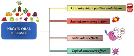 The NBCs act thanks to various mechanisms in countering the oral diseases onset and progression: (i) they can act by the oral microbiota positive modulation and thus, preventing the onset of dysbiosis, closely related to the increase in oral infections susceptibility; (ii) they are able to exert an anti-inflammatory action, preventing/treating inflammatory oral diseases, such as periodontal disease; (iii) they perform antioxidant effects, preventing the OS. The latter impairs the immune defences, making the host more susceptible to oral infectious diseases, such as gingivitis by herpes virus and candida; (iv) they exert also a topical anticancer effect on oral cavity cells and tissues, reducing the onset and progression of cancer typical of the oral cavity, such as oral squamous cell carcinoma (Figure 3).