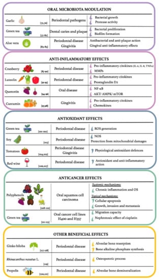 Furthermore, in vitro studies show that quercetin, a flavonoid in grapes, apples, and onions, inhibits the synthesis of TNF-α by oral macrophages through the nuclear factor-κB (NF-κB) pathway suppression [,]. Moreover, quercetin seems to reduce the IL-1β, IL-6, IL-8 and TNF-ɑ production and the COX-2 activity, suppressing the AKT/AMPK/mTOR pathway, in oral mucosal keratinocytes. These beneficial actions demonstrate quercetin’s protective role in countering inflammatory oral diseases [].