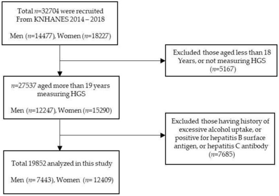 Figure 1 shows the schematic process of participant selection. Among a total of the 32,704 participants, we excluded subjects who met the following criteria: (1) age ≤ 19 years; (2) absence of handgrip strength data; (3) alcohol consumption per week >140 g for men and >70 g for women [20]; (4) positive for hepatitis B surface antigen or hepatitis c antibody [21]. After inspecting the exclusion criteria, 19,852 subjects were included in our analysis. All participants signed an informed consent form.