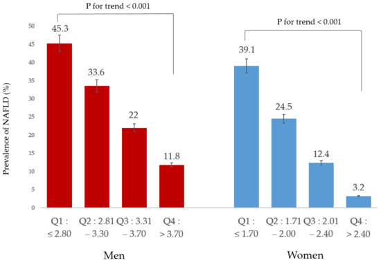 NAFLD prevalence was reduced with increasing relative handgrip strength quartile in both sex (Figure 2). This shows that a dose-response association was observed between relative handgrip strength and NAFLD.