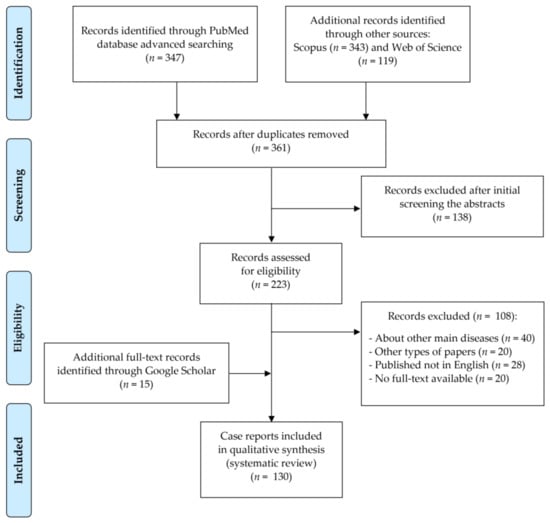In this systematic review, 130 papers following the search criteria were included (the list is attached as Supplementary Materials). Case reports were described in 28 different countries, considering a total of 180 patients (including 91 females). Among them, 74 contained long-term descriptions of clinical observations. Figure 2 shows the detailed selection strategy of the articles. The inclusion and exclusion criteria are presented in Table 1 (in Section 2).