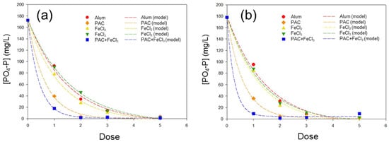 The five coagulant trials (alum, PAC, FeCl2, FeCl3 and PAC + FeCl3) were compared for their phosphate removal efficiency from the anaerobic sludge (Figure 1). Overall, the phosphate removal efficiency elevated as the coagulant dosage increased. This tendency was confirmed by the high coefficient of determination (R2 > 0.99) for the exponential decay models (Table 3). Total phosphorus was removed between 9% and 19% compared to the initial value (1197 mg/L).