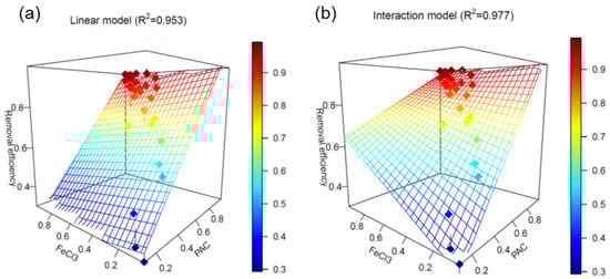 Three-dimensional plots of the (a) linear and (b) interaction models for the phosphate removal efficiency using coagulant combination (PAC + FeCl3) to individual coagulants (PAC or FeCl3).